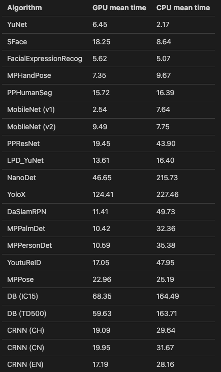 This is a comparison of the preprocessing + inference + post processing time between the GPU and CPU for several algorithms: