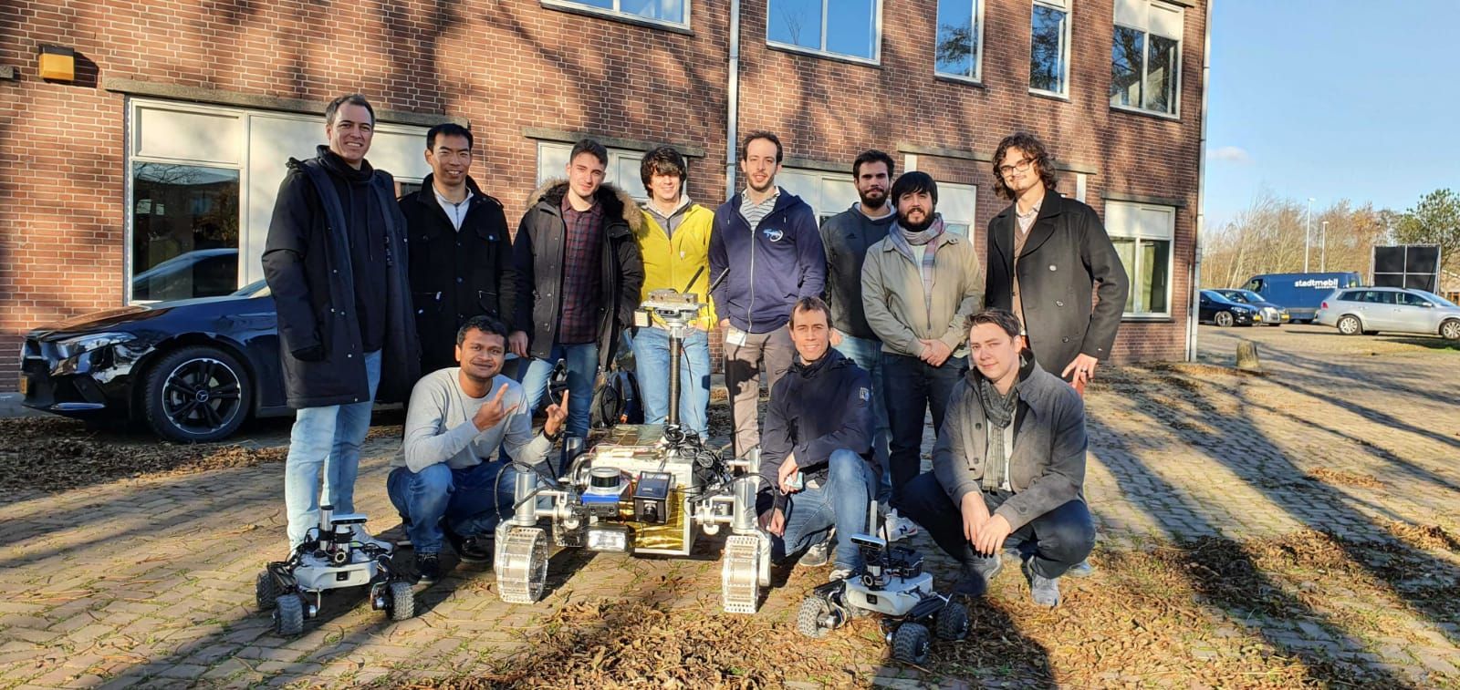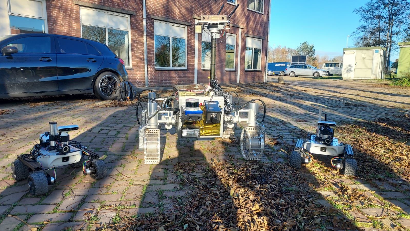 Our team was not only including Space Application Services and the LUVMI-X rover, but also Leo rovers from the Space research at the University of Luxemburg that were meant to explore the area before our rover. Once they would explore this area, LUVMI-X was able to go to a region of interest and with scientific instrumentation take useful information to enable a Geologist to study it. Here you can see our robots: