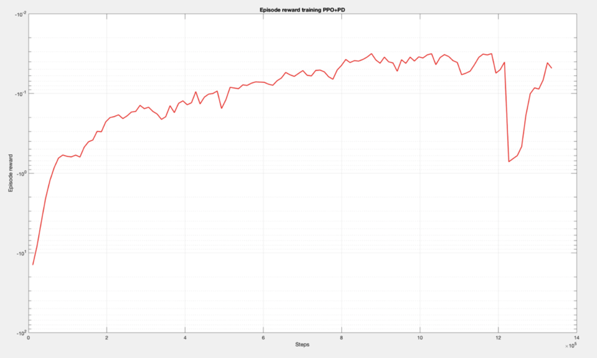 Finally, after studying the accumulation of the position error in each step for several trajectories, the RL+PD algorithm was able to improve this metric by 40% compared to the single PD controller.