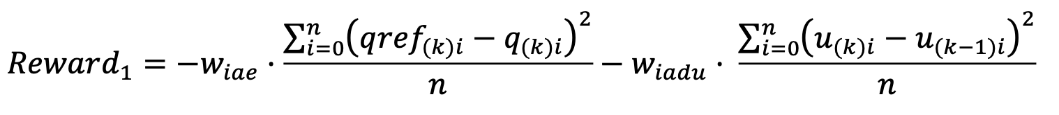 These algorithms were training with a dataset of a 100 different trajectories and evaluated afterwards with trajectories that were not used for training. Something very important in Reinforcement Learning is to define the Reward function. I experimented with several variations. When working with robots, it is not only important to minimize the position error, but also to have a smooth enough control action, something that is actually achievable by the physical actuators. This is why this reward function, which has a term to penalize the position error, but also the increment of the control action: