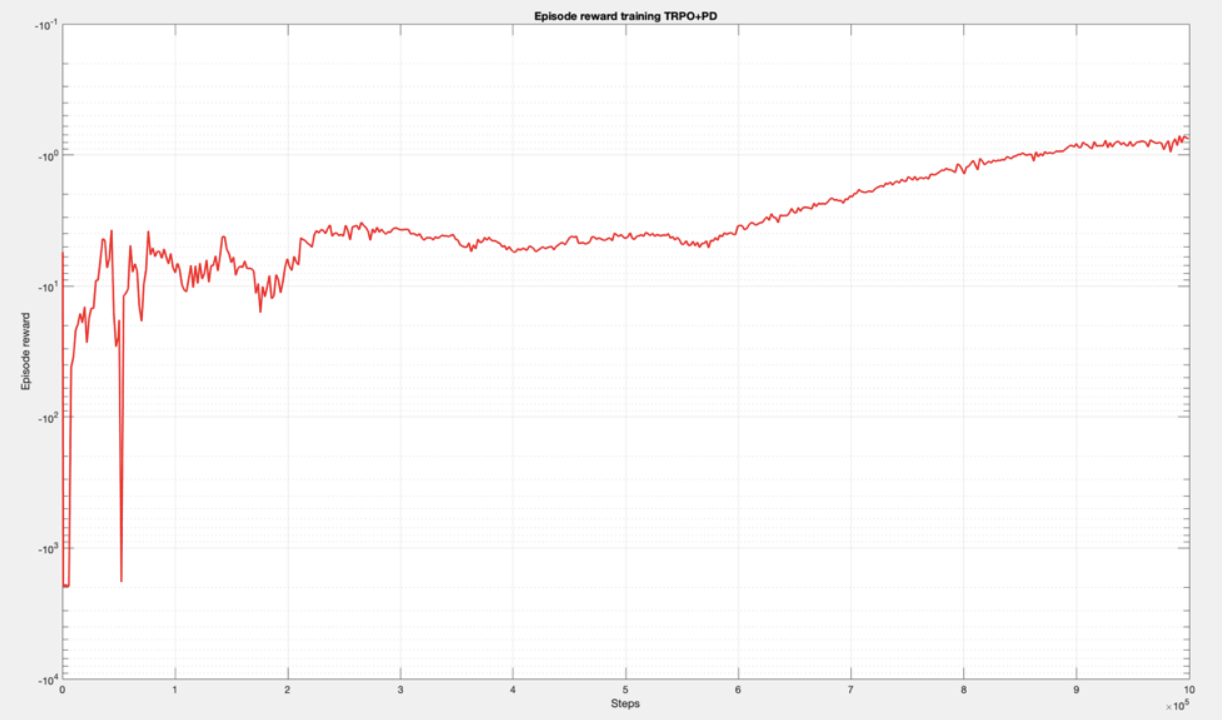 The apprach I followed was to combine a PD controller with a Reinforcement Learning algorithm, so that the RL algorithm would learn to model errors caused by friction, gravity, dynamics, etc. I got the best results with the TRPO and PPO algorithms. Stable Baselines also provides logging info based on Tensorboard to monitor the training process. Here you can see some of the results (reward obtained in each step during training):